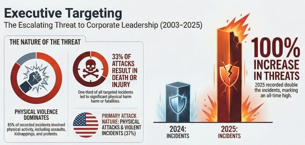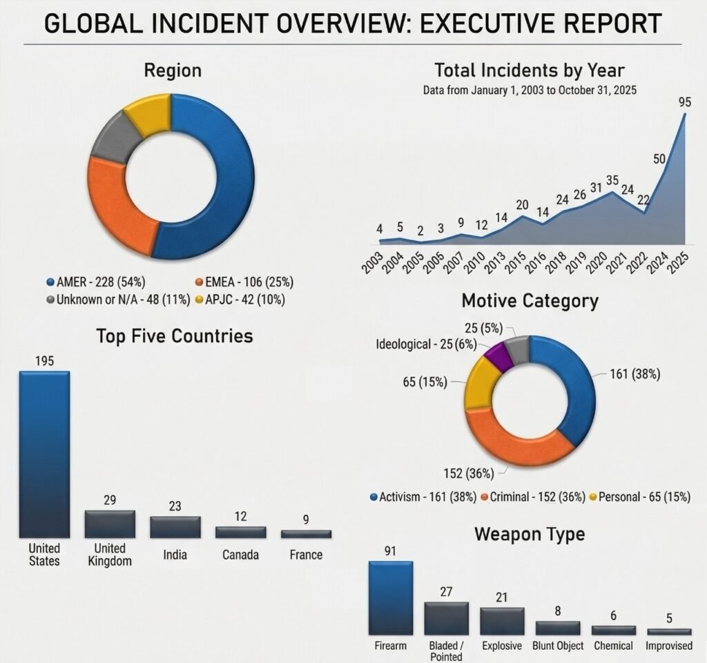 The landscape of corporate security is facing an unprecedented escalation. According to the Security Executive Council (SEC) — a private research and advisory firm — its Executive Targeting Report, which analyzed 424 open-source reported incidents worldwide from 2003 through October 2025, threats against corporate leaders have surged dramatically. In 2025 alone, the total number of recorded incidents increased by 313% compared to 2023. The data paints a sobering picture for protective intelligence professionals: 33% of all targeted incidents resulted in the death or physical injury of the executive.