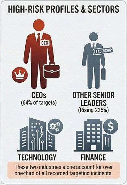 Demographically, 84% of targeted executives are male, but incidents involving female executives have doubled (a 100% increase) since 2021, reaching record levels in 2025. Industry-wise, executives in the financial and technology sectors are the most vulnerable, each accounting for 17% of total incidents, closely followed by the manufacturing/industrial sector at 12%.