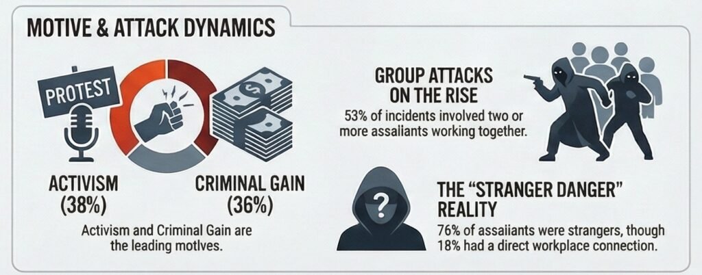The motives driving these attacks are broadly categorized into activism (38%), criminal intent (36%), and personal grievances (15%). Crucially, incidents driven by personal grievances are disproportionately lethal. While they make up a smaller percentage of overall attacks, nearly 80% of personal-motive assailants were armed, indicating a much higher potential for severe outcomes. Overall, weapons were confirmed or suspected in 37% of all incidents, with firearms being the leading weapon of choice (22%).