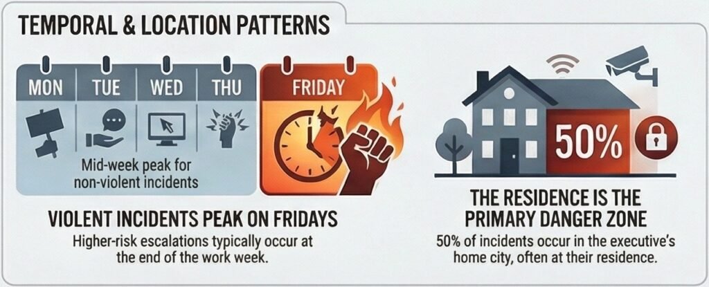 The physical domain remains the primary vector for violence, comprising 85% of all incidents. In physical assaults, 75% of attackers utilized walk-up or ambush tactics. Violent incidents tend to escalate toward the end of the workweek, peaking heavily on Fridays.