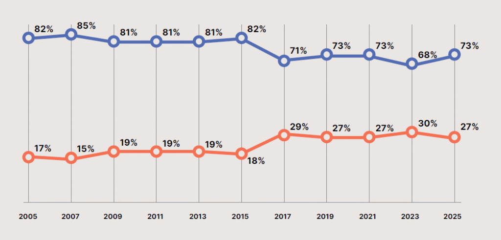 The prevalence of sexual violence is particularly alarming. 10.7% of women—approximately 5.3 million—reported sexual abuse or being forced to engage in sexual activity against their will. Verbal violence remains the most common form of abuse, affecting 31.4% of women, or about 17.7 million, through insults, humiliation, and verbal attacks. Physical aggression was reported by 16.9% of respondents, equivalent to 8.9 million women, the highest rate since 2017. Other recurring forms of violence include threats of physical aggression (16.1%, or 8.5 million women), stalking[1] (16.1%, also affecting 8.5 million), and digital violence while 3.9% of women—around 1.5 million—had intimate photos or videos shared online without consent.