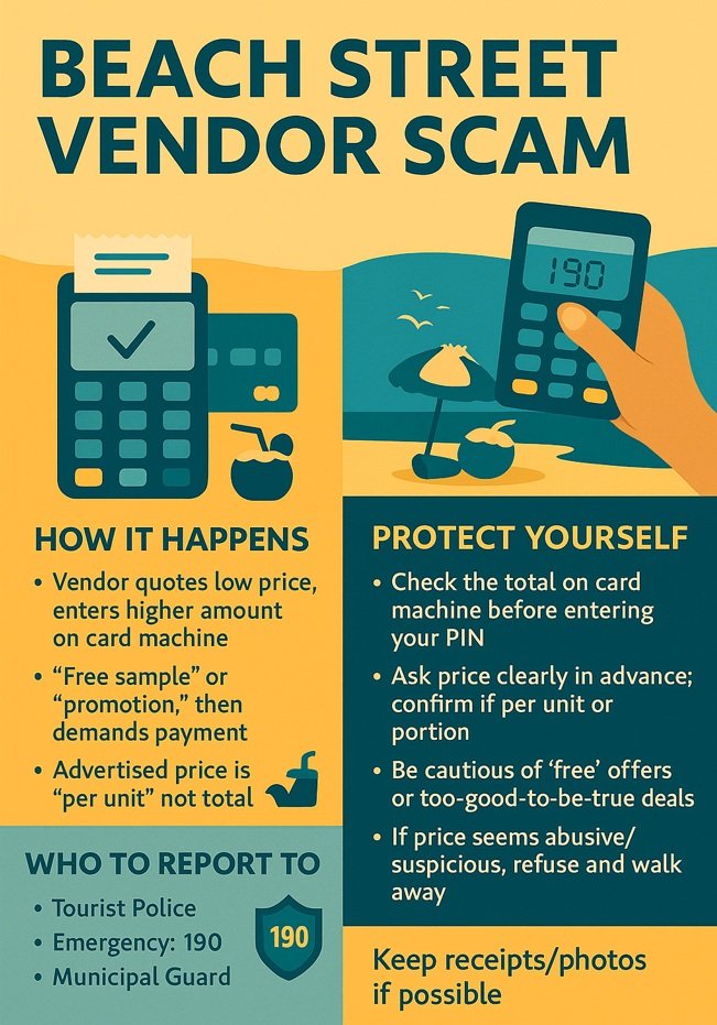 On Rio’s beaches, street vendors – known as ambulantes in Brazil – are a common sight, offering drinks, snacks, or even seafood to tourists. While many operate legally, some take advantage of visitors through fraudulent practices. One of the most frequent scams occurs when vendors deliberately lie about the price of what they are selling. For example, they may say that a dish costs a small amount but then enter a much higher value on the card machine. They might also advertise something as a “promotion” or “free tasting” and later demand payment.