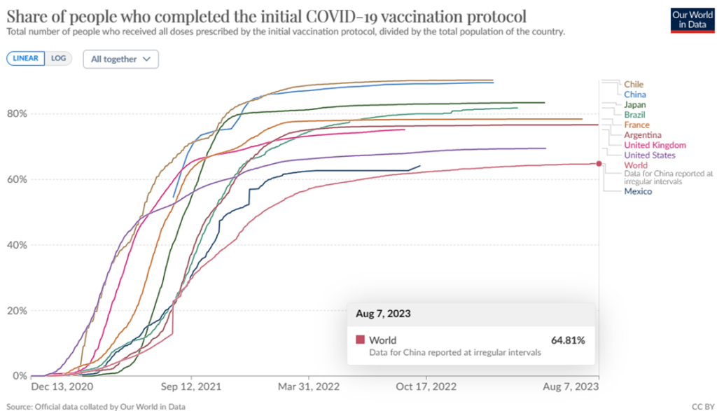According to the latest information released by the Brazilian Health Ministry webpage, on Monday (28/08) at 06h00, 167 million second doses, and 5.053 million single doses have been given. The results represent that a total of 84.86% people were fully vaccinated. Brazil has approximately 203 million citizens, according to IBGE. Worldwide, data from 07 August indicates that 64.81% (5.17 billion) of people are fully vaccinated. Below, the graph with Brazil and other nations.