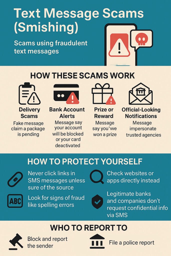 Smishing—short for SMS phishing—is a type of fraud carried out through text messages sent to mobile devices. Criminals pretend to be trusted companies, delivery services, or even government agencies to trick victims into clicking on malicious links or sharing sensitive information. Once the victim interacts, scammers can collect personal data, commit identity fraud, or even steal money directly from bank accounts.