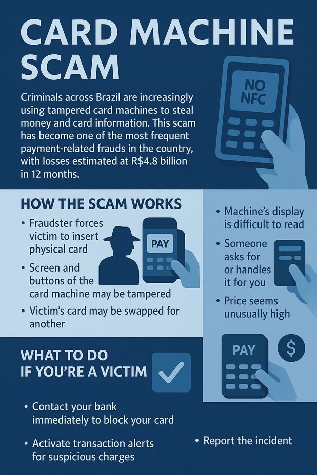 Criminals across Brazil are increasingly using tampered card machines to steal money and card information from unsuspecting customers. This fraud has become one of the most frequent and costly payment-related scams in the country, with losses estimated at R$4.8 billion in just 12 months.