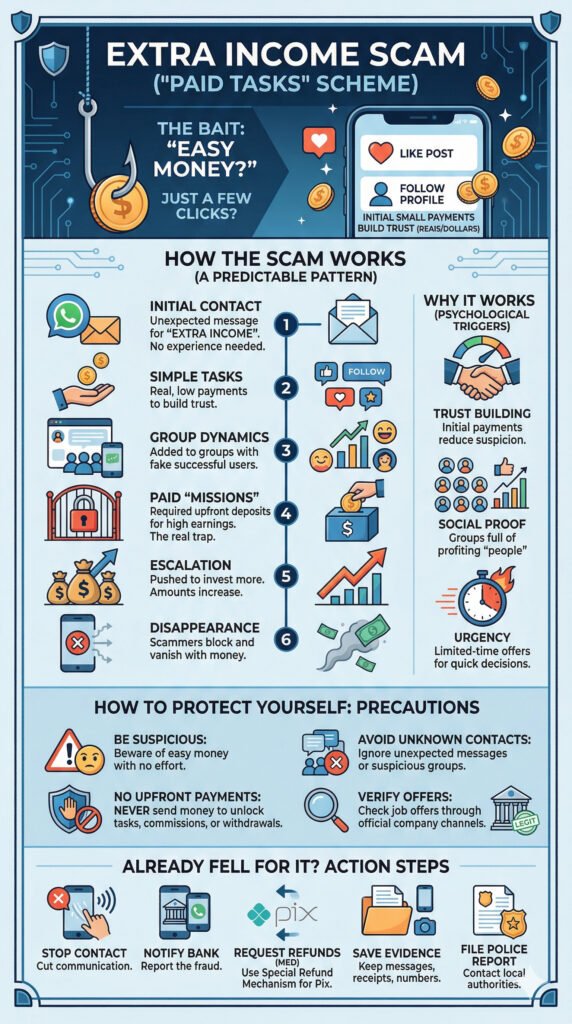 Making money with just a few clicks? Sounds tempting… but that’s exactly how scammers hook their victims. The “extra income” or “paid tasks” scam has been spreading through messaging apps like WhatsApp and Telegram, promising quick and easy earnings. In reality, it’s a well-structured fraud designed to gain your trust—and then take your money.