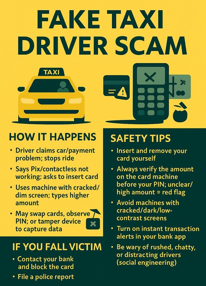 You get into a taxi thinking it will be a normal ride, but the ending can feel like a scene from an action movie. The fake taxi scam is sneaky and quick, often leaving passengers overcharged or worse. The driver may claim there is a problem with the car and needs to stop the ride, then he insists that Pix or contactless payments aren’t working and asks you to insert your card into a machine. Some machines have damaged or darkened screens, preventing you from seeing the whole amount typed, and the scammer can charge far more than the agreed fare. In more sophisticated cases, the driver may swap cards, observe your PIN, or tamper with the machine to capture your data. Later, he will use your card and PIN for unauthorized purchases once you leave.