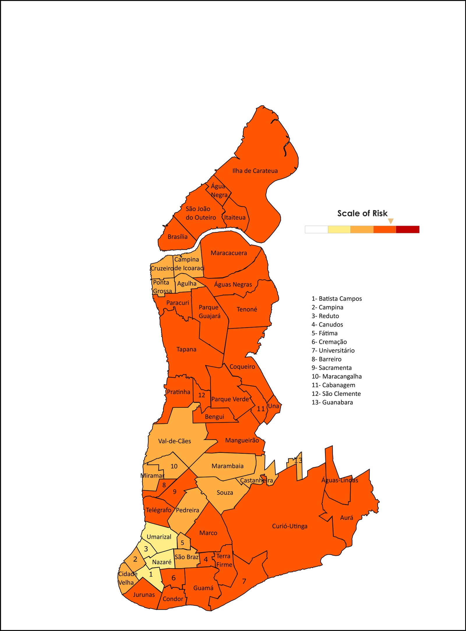 - Some of the most risky neighborhoods are: Jurunas, Condor, Guamá, Terra Firme, Res. Liberdade 2, Curió-Utinga, Barreiro, Sacramenta, Pratinha, Cabanagem, Benguí, Tapanã, Paracuri, Parque Guajará, Tocantins, Quarenta Horas, Tenoné, Icuí-Guajará, Cidade Nova, Curuçambá, Águas Lindas.