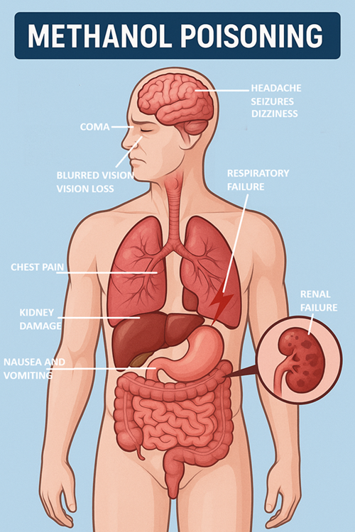 Even small amounts of methanol can cause severe poisoning when ingested, inhaled, or absorbed through prolonged skin contact. Once inside the body, the liver metabolizes methanol into formaldehyde and formic acid, substances that interfere with the central nervous system and lead to metabolic acidosis. These reactions cause damage to the optic nerve, brain, and other organs.