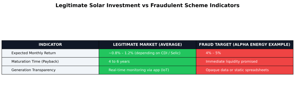The investigation centered on Alpha Energy Capital, which operated offices in Natal and Barueri and promised investors fixed monthly returns between 4% and 5%, allegedly generated through the commercialization of solar energy credits. The company advertised eleven solar plants with a projected output exceeding 1.2 million kWh per month. However, investigators identified only one operational facility connected to the grid, producing a fraction of the claimed capacity. Regulatory checks confirmed the absence of proper authorization to generate or trade electricity.